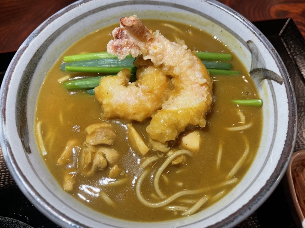 地鶏と海老天の入ったピリ辛カレーそば